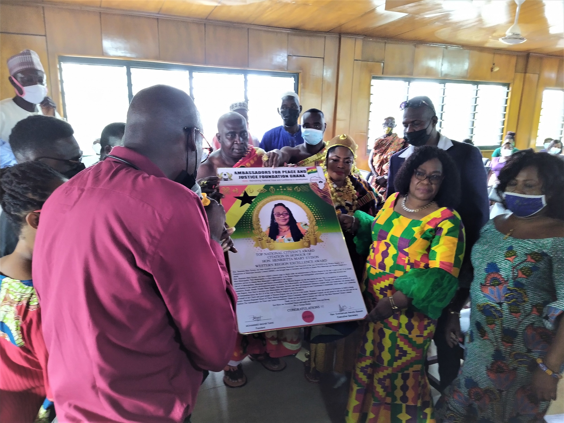 2. An award to Henrietta Mary Eyison (Hon.), the Municipal Chief Executive by Ambassadors for Peace and Justice Foundation Ghana as the best performing MCE/ Municipal Assembly in the Western Region for the year 2019/2020.